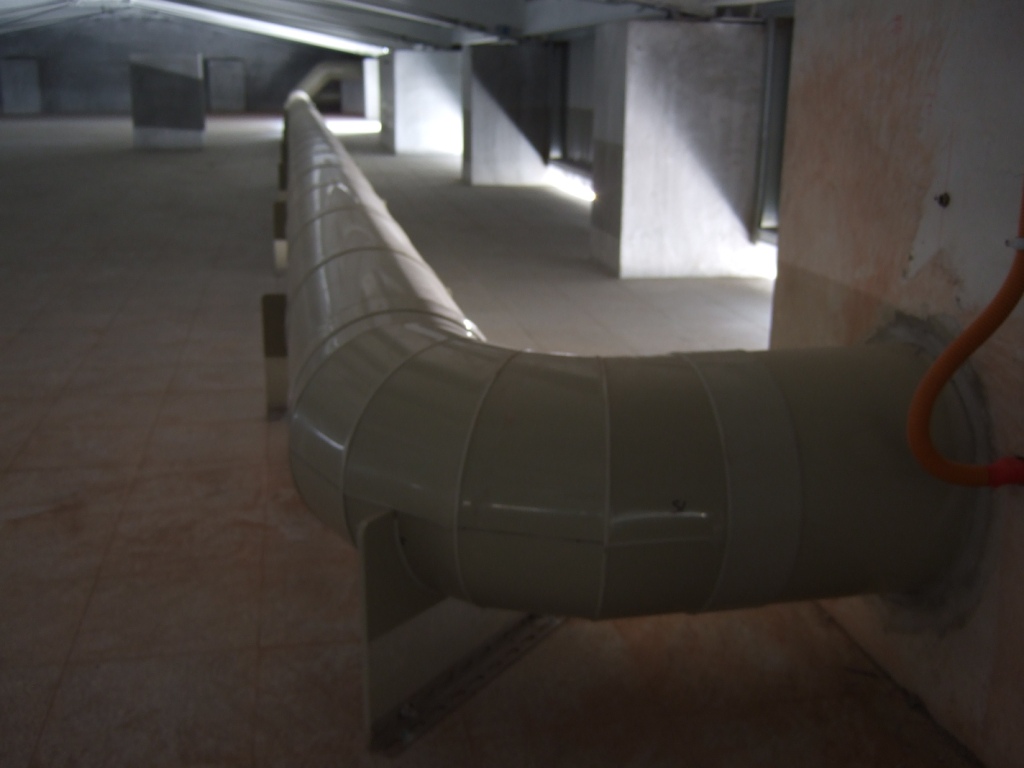校方採購兩座洗滌塔,各控管兩間實驗室內的排氣櫃及七台藥品櫃等,管路由1F至4F頂,其抽排風機僅使用3HP變頻馬達,驗收標準為兩間教室,四台排氣櫃同時開啟,排氣櫃門開45公分測得風速每秒鐘0.5以上,噪音60分貝以下,且變頻馬達僅使用約一半馬力,達到節能省碳之功效。