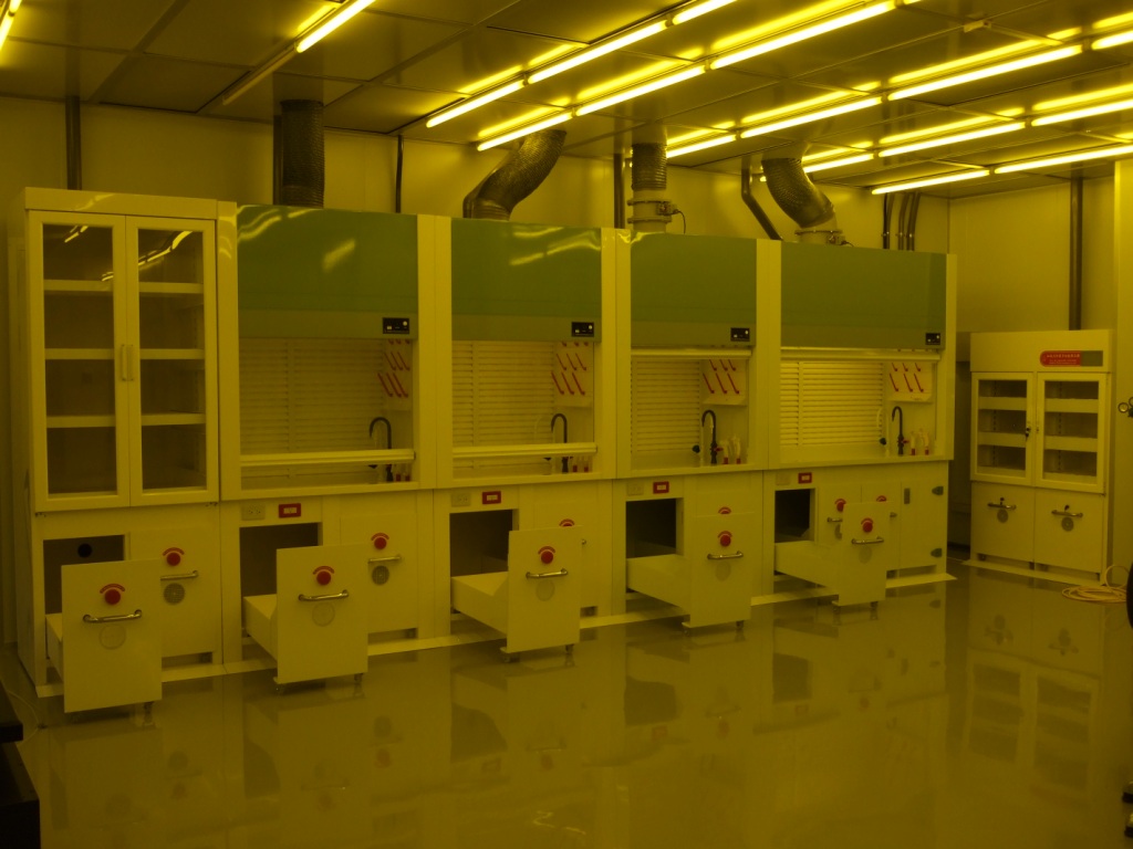 洗滌塔連接設備:排氣櫃 5 台、藥品櫃 3 台、廢液暫存櫃 5 台、玻璃器皿晾乾箱 1 台、銜接無塵室內部精密儀器抽氣支管約25支