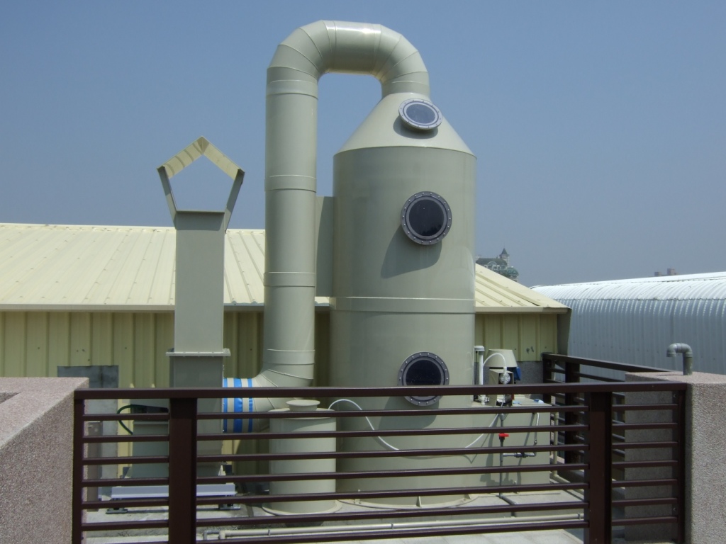 校方採購兩座洗滌塔,各控管兩間實驗室內的排氣櫃及七台藥品櫃等,管路由1F至4F頂,其抽排風機僅使用3HP變頻馬達,驗收標準為兩間教室,四台排氣櫃同時開啟,排氣櫃門開45公分測得風速每秒鐘0.5以上,噪音60分貝以下,且變頻馬達僅使用約一半馬力,達到節能省碳之功效。