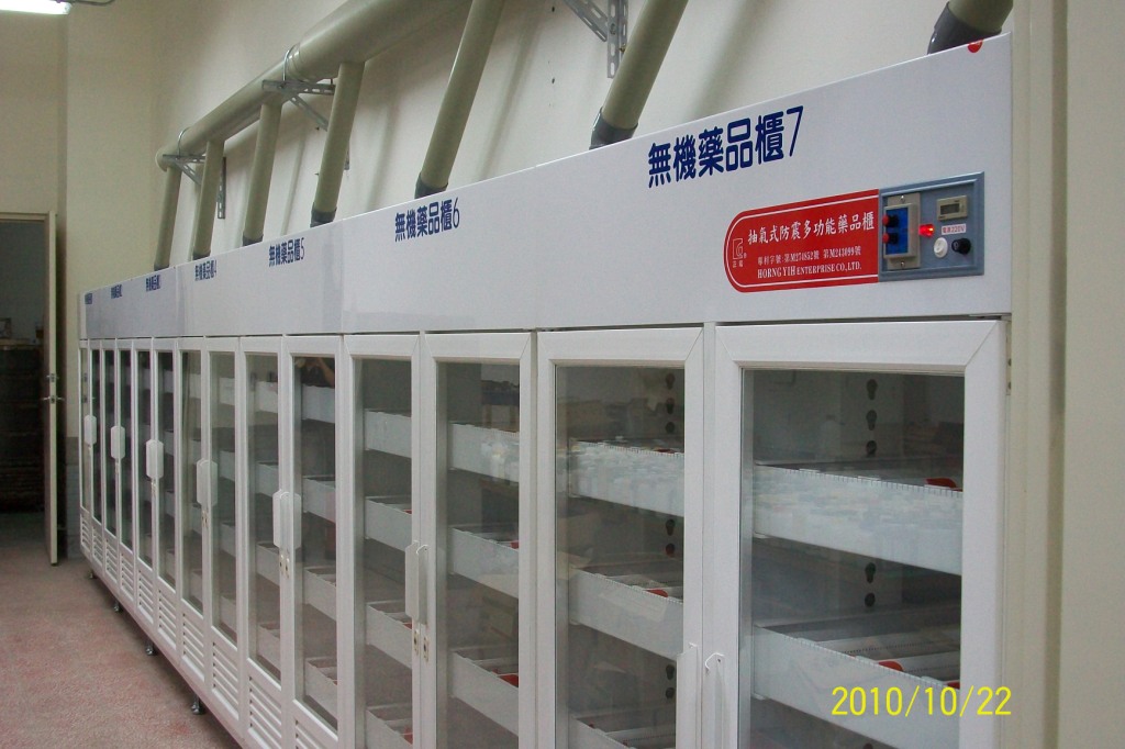 貴校採購抽氣式防震多功能藥品櫃12台,並以中央控制方式串聯12台,從一樓至頂樓配管排放。
